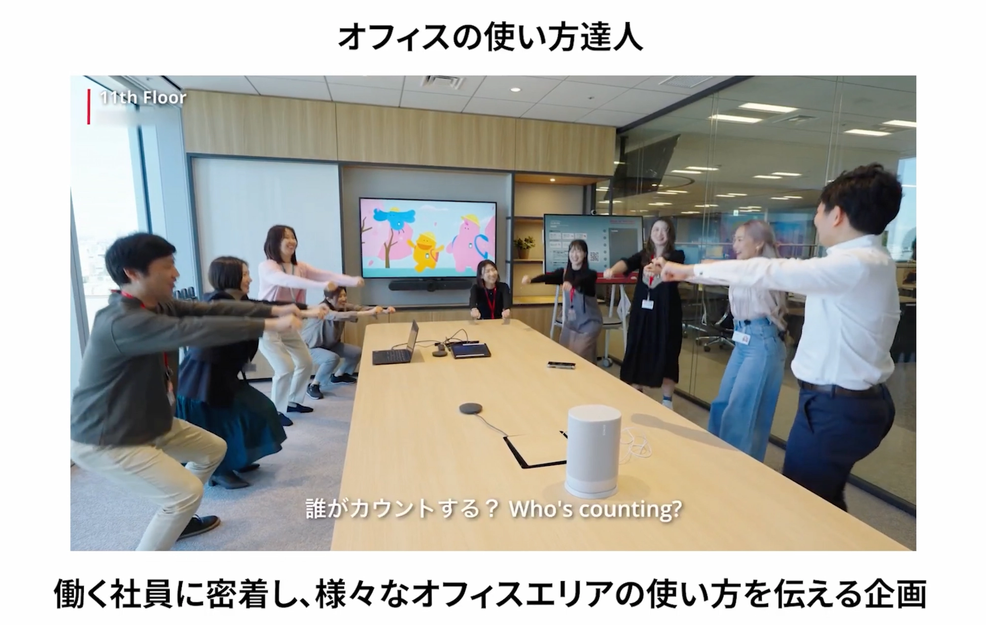 1つは「オフィスの活用達人」という、従業員の一日に密着し、どの空間をどう活用しているかを発信する取り組みです。もう1つは、空間にフォーカスして定点観測し、誰が何をしているかを発信するものです。こちらは、目につきやすいところにあるデジタルサイネージで常に発信しているのがポイントです。仮に同じ映像をポータルサイトにアップしても誰も見てくれないんですよね(笑)。