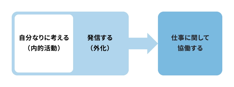 私が実施した企業の管理職へのインタビューからは、管理職が考える主体性は、まずは「自分なりに考える」ことだとわかりました。さらに、多く聞かれたのが「発信する」という言葉です。仕事となれば、考えるだけでは不十分で、発信も必要になりますよね。そして、発信しても仕事に結びつけなければ意味がありませんから、「仕事に関して協働する」ことまでが企業における主体性だと考えることができます。それを表したのが、下記のモデル図です。