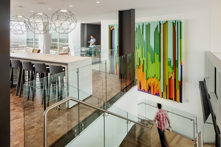 また、建物の入り口に展示されているグラフィック作品は、複数の色や層で多様な人々とそれぞれの祖先を表現している。重複した色は、世界の歴史が気付かぬところで強いつながりを持ち、構築されてきたことを表しているのだ。オフィスのブランディングを手掛けたVisionも、「敷地の性質上、壁面にAncestryのコアバリューにつながるアートを配置することが最も現実的な選択肢だった」と語っている。