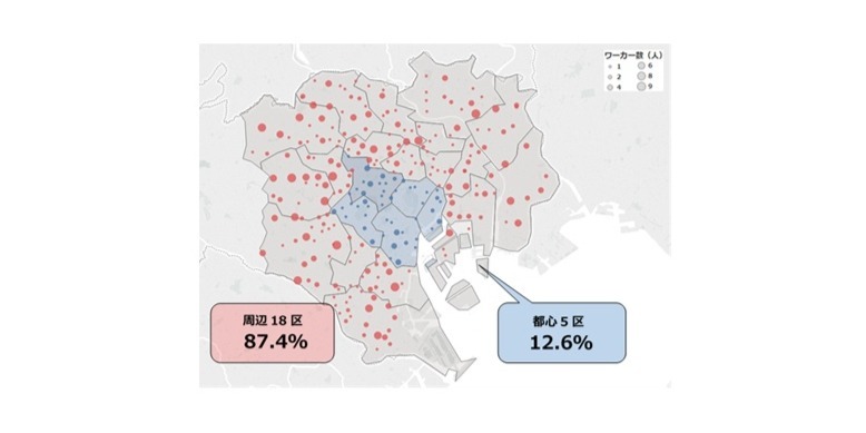 参考までに、ザイマックス不動産総合研究所が行ったフレキシブルオフィス市場調査2020(2020年1月実施)で、コロナ以前における東京23区内のオフィスストックとフレキシブルオフィス市場を見てみると、フレキシブルオフィスの8割以上が都心5区(千代田区、中央区、港区、渋谷区、新宿区)に集中していることが分かる。その一方で、ワーカーの約9割の自宅最寄り駅は周辺18区にあり、自宅近くで働く選択肢は極めて少ないと言える。